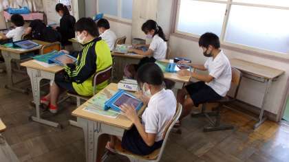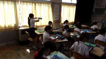 完成したビオトープの絵について、見てもらう人へのメッセージを考えるとともに、取り組みの振り返りをしていました。こうした場面でも、タブレットを使うことが増えてきています。