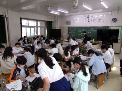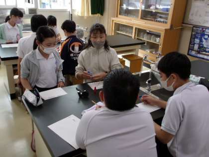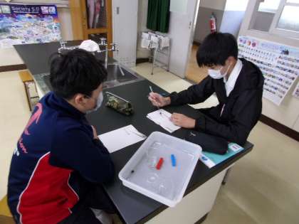 リトマス紙を使って、それぞれの水溶液が酸性かアルカリ性かを調べています。