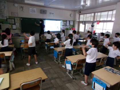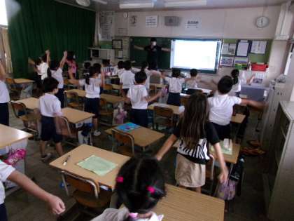 スポーツフェスティバルのダンスの練習です。画面を見ながら、振り付けを覚えています。