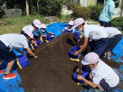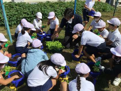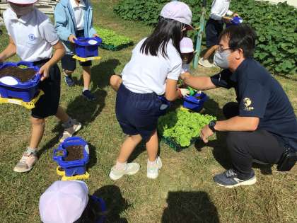 大橋園芸さんのお手伝いのもと、リーフレタスを植えました。早く大きくなってほしいという気持ちを込めて植えていますね。