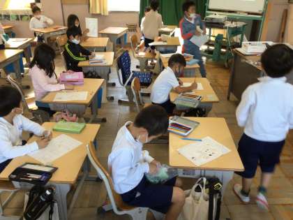 自分で育てたアサガオの種を観察しています。種はどんな様子かじっくり見ていますね。大事に育てるといっぱい種が取れるんだね。