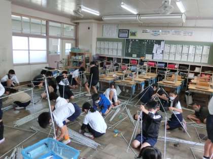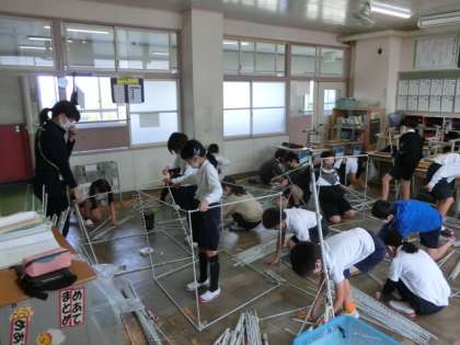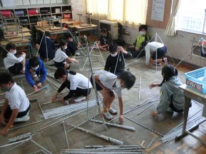 新聞紙を細く丸めた棒を部品として、オブジェを制作していました。