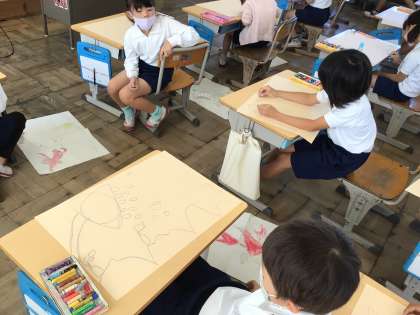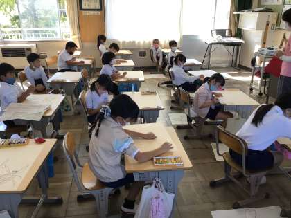 読書感想画「ザリガニのあかくん」の下絵を描いています。いろいろな生き物が登場するので、何を描こうか迷ってしまいますね。