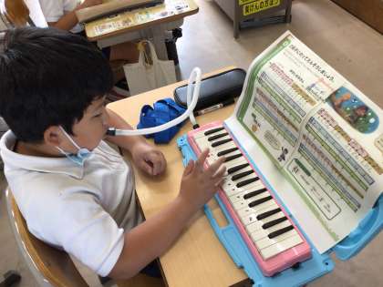 けんばんハーモニカで2拍子の演奏を行なっています。リズムに合わせて、みんなで演奏できていましたね。