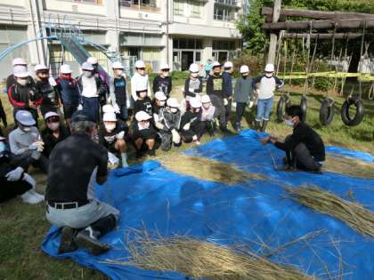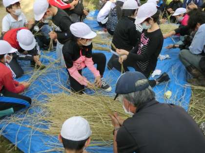 5年生は、刈り取った稲を束ねる縄である「すがい」も講師の方々に教えていただき、自分たちで作りました。