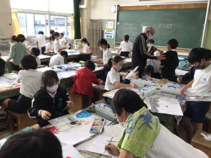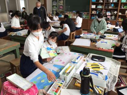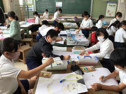 読書感想画の下書きに彩色しています。色の組み合わせ方や、クレヨンやペンなど素材の違うものを組み合わせて自分だけの作品を描いています。
