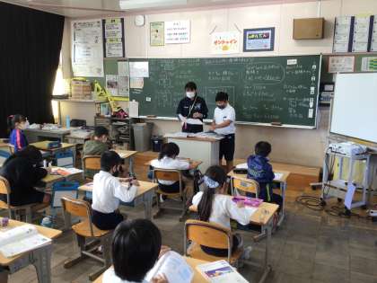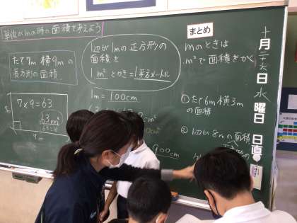 単位がmのときの面積の表し方について勉強しています。みんなで確認しながら進めていますね。