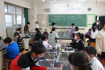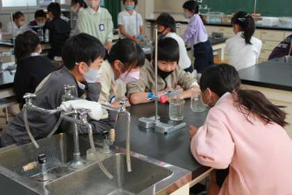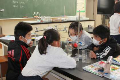 理科室で実験を行いました。温かいお湯につけると水の体積はどうなるか確認していました。