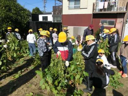 おしどり会の皆様のお力添えをいただき、枝豆の収穫をしました。春に植えた大豆は、もうここまで育っています。とても大きな豆が入っているようでした。3年大豆種まき