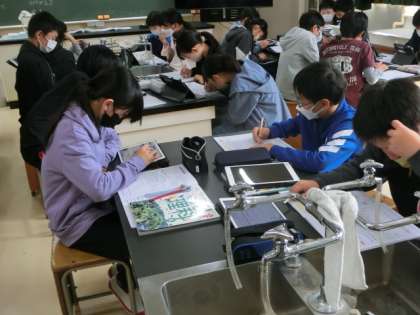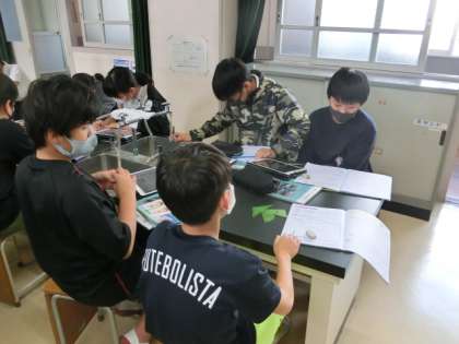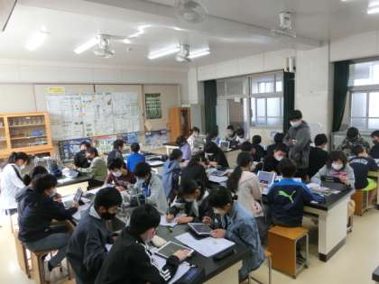 火山活動地震で起きる土地の変化について、動画を見たり、タブレットで検索したりしながら学習していました。