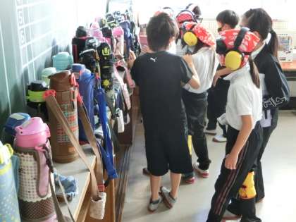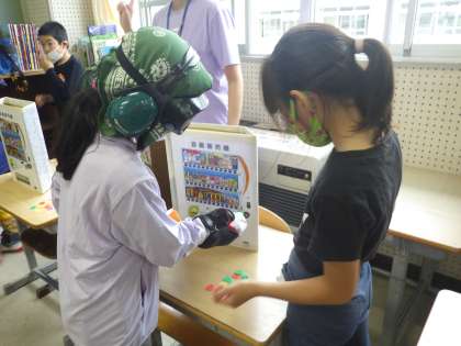 その後、3つのことを体験しました。上の写真は、ロッカーの後ろにある水筒置き場で自分の水筒を探している様子です。真ん中の写真は、色のコントラストに違いがある2枚のポスターを見比べている様子です。下の写真は、自動販売機(模型)に小銭(おもちゃ)を入れようとしている様子です。子どもたちは、ちょっとしたことが難しいこと、ほんの少し周囲の助けがあれば安心できることなどを、実感していました。