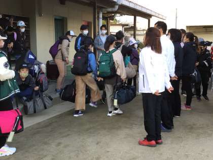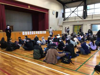 体育館に集まった6年生は、まず健康観察をしました。出発式で、修学旅行の目標を確認して、元気に「行ってきます」の挨拶をしました。保護者の皆様、早朝からの送り出し、お見送りありがとうございました。