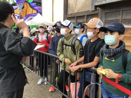 映画村の「お化け屋敷」に、たくさんの子が並んでいます。史上最恐のお化け屋敷に、入っていく子どもたちです。どんな顔で出てくるでしょう。
