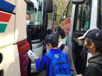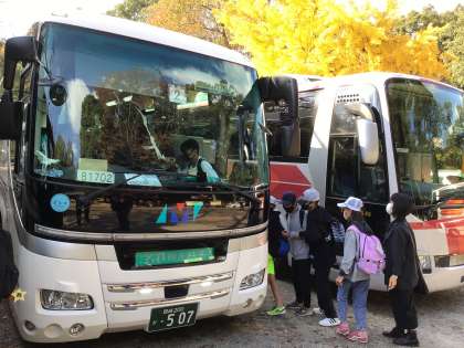 昼食はカツカレーでした。バスに乗って法隆寺へ向かいます。みんな元気です。