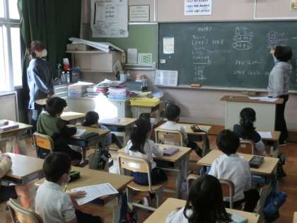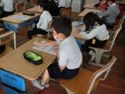 やはり、jump jumpタイムの準備です。初めて取り組む1年生なので、やり方の説明もていねいに行っています。説明を聞き、がんばりカードを記入していました。