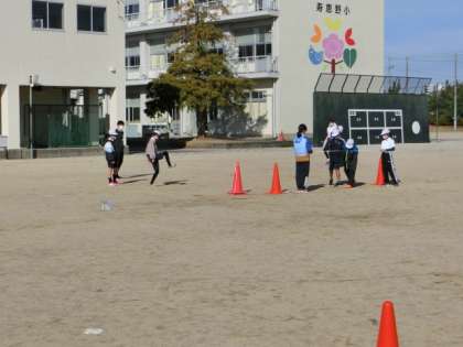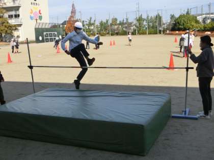 走り高跳びをしていました。小学校では、基本的にはさみ跳びで行います。助走のコース・リズムや踏み切り足と抜き足の動かし方がポイントになります。ゴムで練習している子もいます。