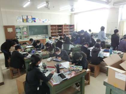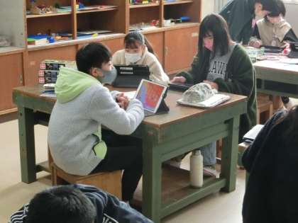 芯材をベースに、作品を作ります。そのために、計画を考えています。タブレットでヒントを探している子もいます。