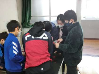 ゼネコン(手回し発電機)で作った電気は、乾電池と同じようにはたらく(使える)のかを確かめています。