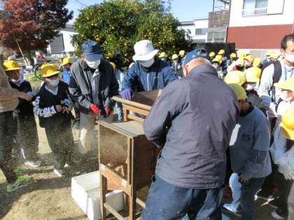 12月12日(月)、おしどり会の皆様に教えていただき、大豆を収穫しました。その後、唐箕を使って、ごみと豆を分けました。