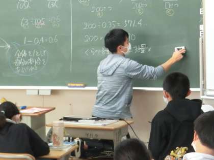 もとになる量と割合をもとに、比べる量をどう求めるかを考えています。割合は、日常生活でもよく使いますが、なかなか子どもたちは苦労する単元です。とにかく慣れていくことが大切です。