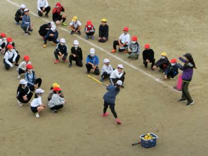Tボールは、基本的に野球やソフトボールを簡易にしたスポーツです。この日は、球を投げたり打ったりする動きを学習していました。