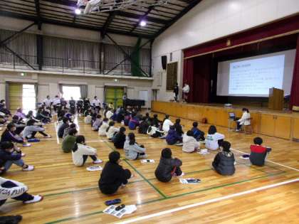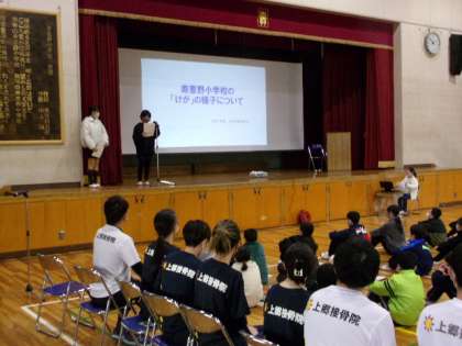 体育館で、学校保健委員会が行われました。参加者は、5,6年児童および関係教職員、PTA保健厚生委員です。まずは、保健委員より本校の怪我の様子について、発表がありました。