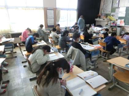 同じ大きさとなる分数(「2分の1」と「4分の2」など)を探していました。まずは、自分で考え、次にペアやグループで意見を交わらせます。