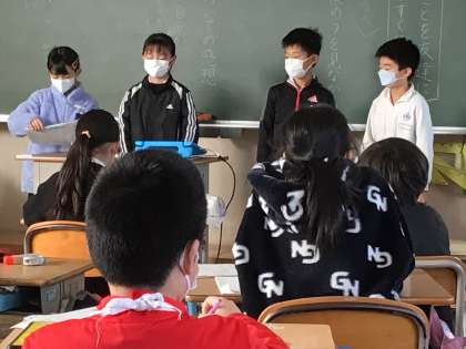 調べたことを友達に分かりやすく伝える学習です。調べたいテーマごとにグループを作って、クラスのみんなにアンケートをとりました。その結果を基に考えて、意見や提案を含めた報告ができました。聞いた子も、感想をしっかりと書いています。