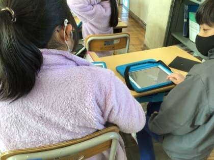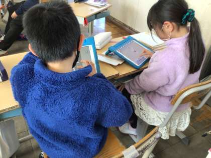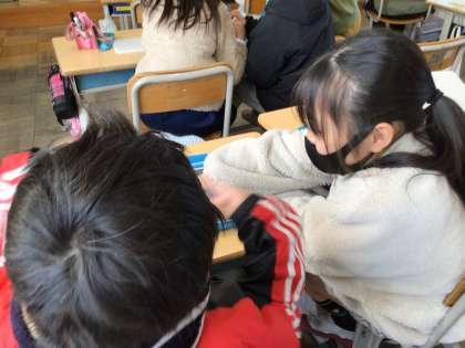 展開図を見て、組み立てた時にくっつく辺や頂点を考えました。ペアで問題を出し合っています。