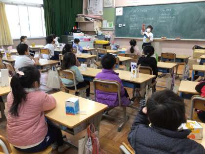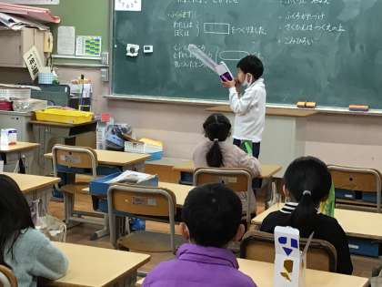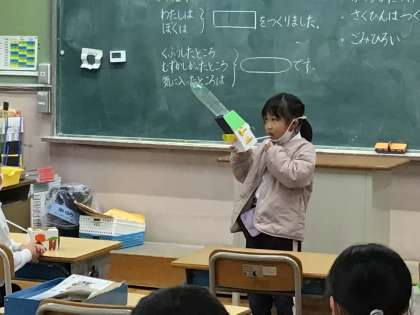 できた作品をみんなに見せています。工夫したところや気に入っているところを紹介しました。