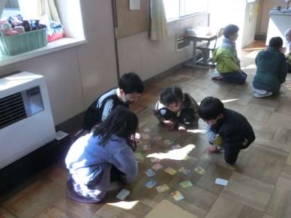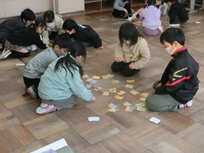 担任の先生が読み札を読み上げ、グループ内で絵札を取り合います。なかなかの真剣勝負で、緊張感がありました。