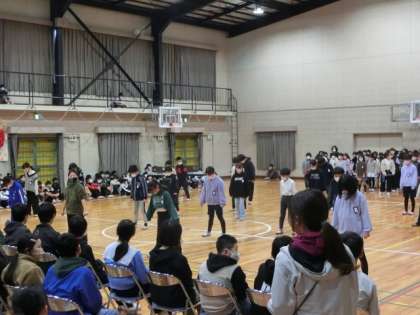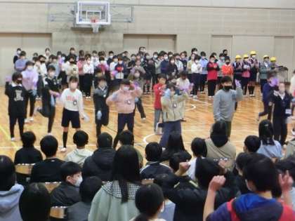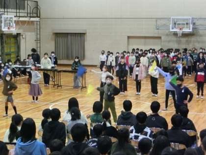 4年生です。小学校生活6年間の卒業生の様々なエピソードを織り込み、発表しました。運動会やダンスフェスティバル・スポーツフェスティバルでの演技の振り付けを、6年生が懐かしそうに振り返っていました。