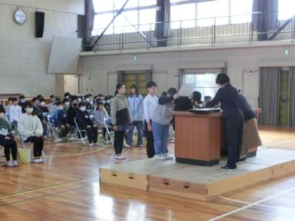 卒業式予行練習(リハーサル)が行われました。5年生が保護者席の位置に座って参加しました。本番通りの流れで、入場〜退場を行い、練習の進捗状況や教職員の動きなどを確かめました。