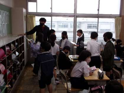 これは、5年2組です。学校で保管する教科書などを集めて、保管場所を確認しています。