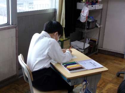こちらは、5年1組。進級記念となる個人写真を撮っています。順番を待っている子たちは自己紹介カードを作成しています。
