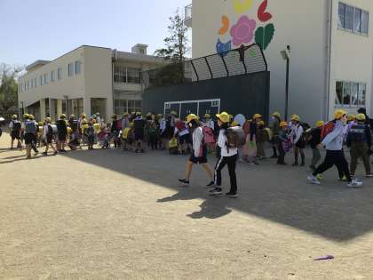 今日から1年生の給食も始まり、一斉下校をしました。通学団で並んだ1年生を、各班の班長さんが迎えに行きました。