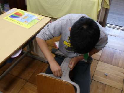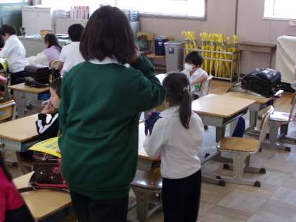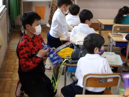 6年生が1年生の教室に来て、1年生の朝の支度を自主的に手伝ってくれています。中には、椅子の高さを調整してくれている6年生もいます。6年生の皆さん、ありがとう。
