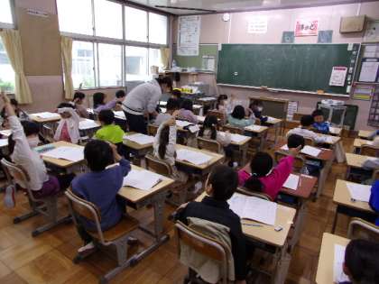 ひらがなの「こ」「い」を練習していました。担任の先生が、みんなの書いた字を確かめています。