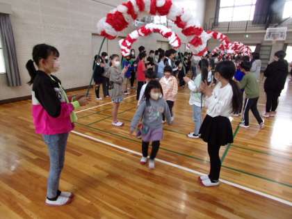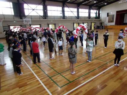「密」防止のため、会には、主役である1年生と最高学年である6年生のみが参加しました。まずは、アーチをくぐって、1年生が入場しました。アーチを持っている6年生以外で、手拍子や拍手をして、楽しい雰囲気を作り出していました。