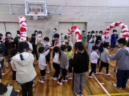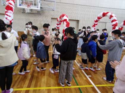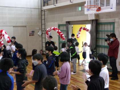 入場と同じく、アーチをくぐって、1年生が退場しました。アーチを持っている6年生以外で、手拍子や拍手をして、楽しい雰囲気を作り出していました。ビュンビュンごまでふれ合った6年生と1年生が、お互いが手を振り合う姿も見られ、とても心が温かくなりました。