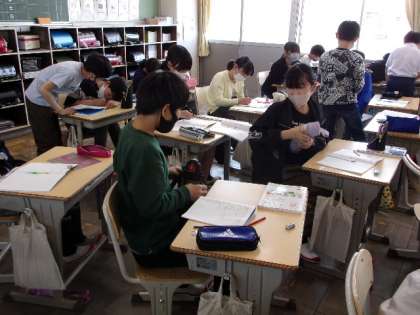 水筒、消しゴム、ロッカー、そうじ道具入れ…などなど、いろいろなものの体積や容積を測っていました。必要な長さを測って、公式で求めます。