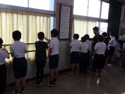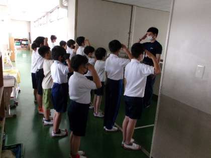 少年消防クラブです。やはり、講師の方に教えていただきます。今日は、ロープワークと集合・整列・点呼・礼などの練習をしていました。