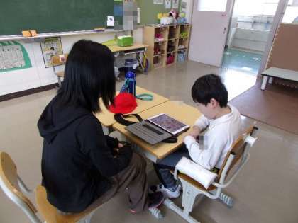 学習用タブレットを使って、食べ物に名前を学習していました。