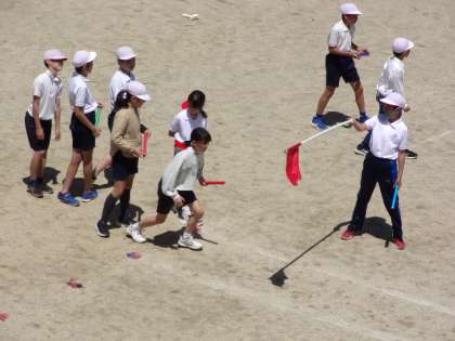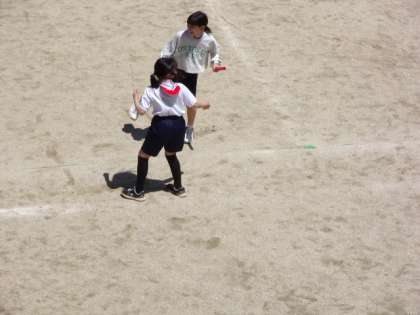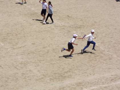 リレーの練習をしています。バトンをどう渡すかで、タイムがかなり変わります。