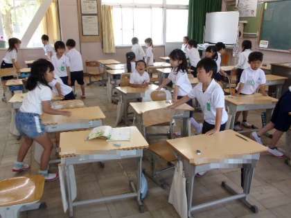 初めての国語のテストだそうです。内容はひらがなです。まずは、テストをするための隊形に机・椅子を移動させます。安全に速やかに移動できました。