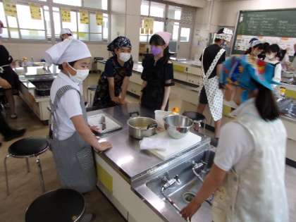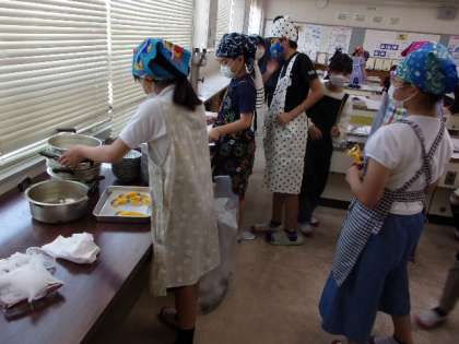 調理実習です。まずは、道具をそろえ、必要に応じて洗います。初めての調理実習だけに、こうしたところから一つ一つの手順をじっくり踏んでいきました。