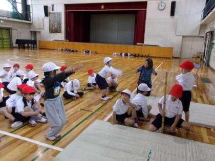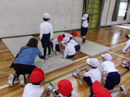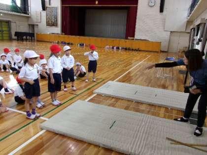 体力テストの種目の一つです。どこから跳ぶか、どのように跳ぶどうやって記録をとるのか、一つ一つていねいに確認していました。