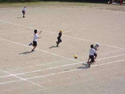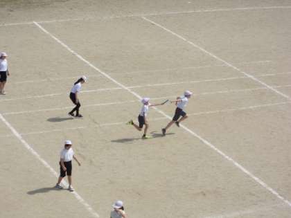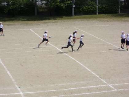 バトンパスの練習です。互いのスピードを無駄に緩めずに済むように、前走者がどこに来たら後走者がスタートするかを、考えながら行っています。スポーツは科学です。