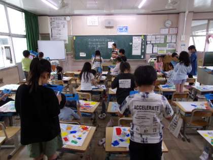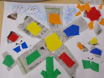 破いた様々な紙(色紙・新聞紙など)を使って、作品を作りました。そして、完成した作品を学習用タブレットで撮影しました。
