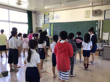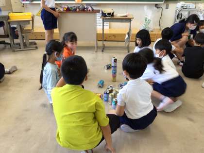 なかよし班の6年生がみんなで楽しめる遊びを考えてくれました。缶積み、的当て、スリーヒントクイズなどどの班も盛り上がりました。